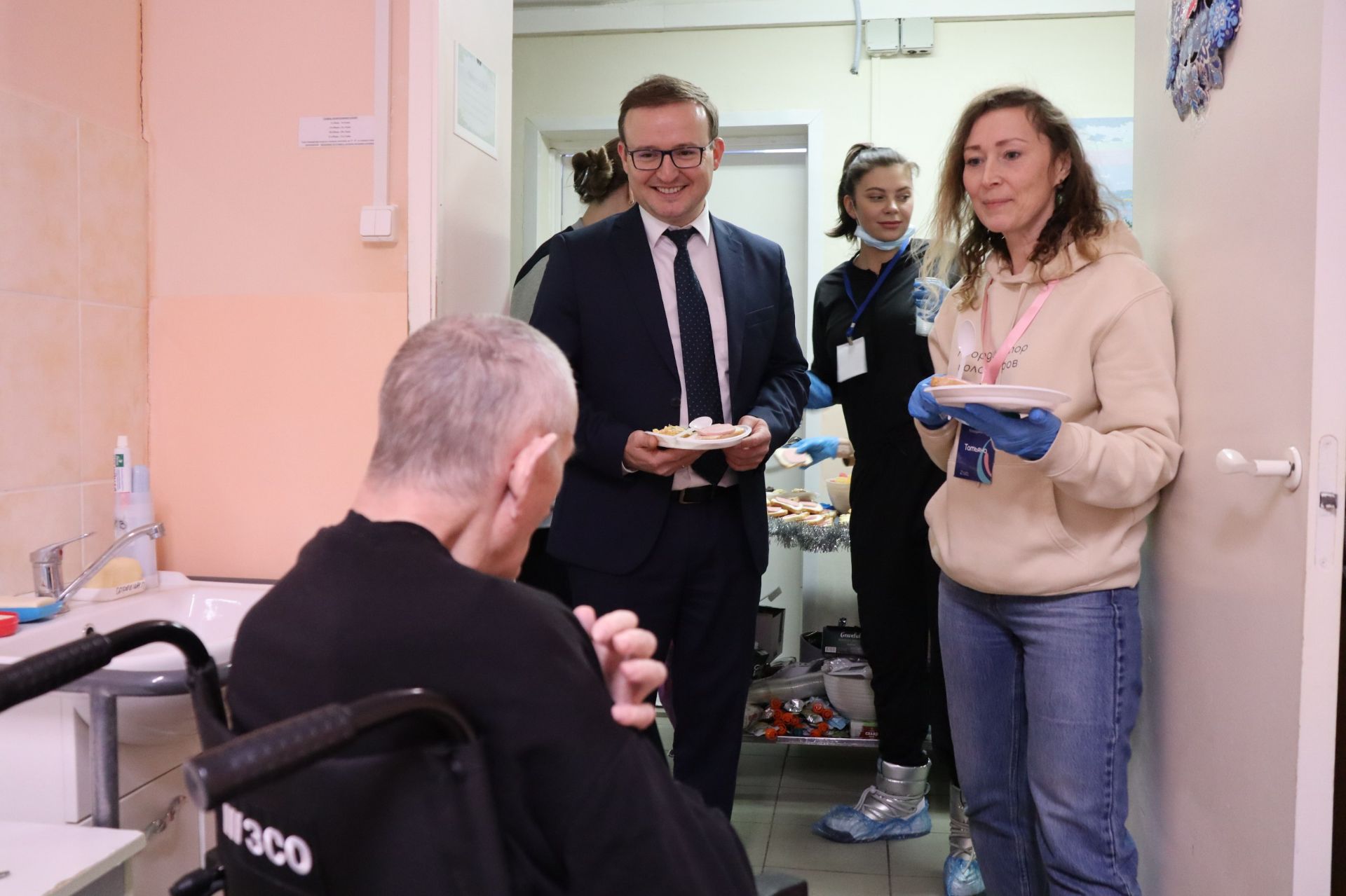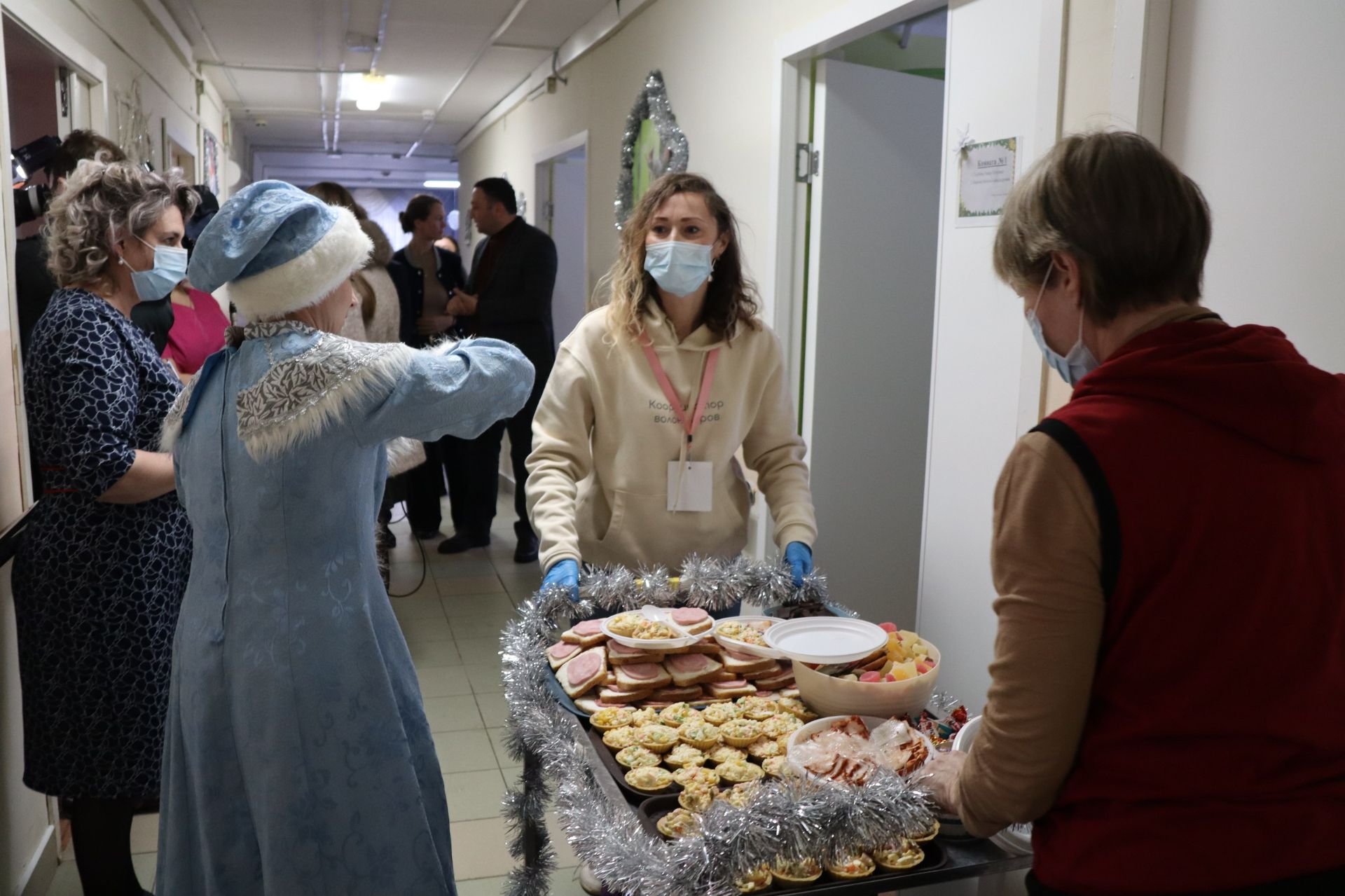 Помимо творческой программы, в интернате прошла предновогодняя акция «Тележка радости»: волонтеры в костюмах Деда Мороза и Снегурочки развозили домашние угощения и подарки тем, кому тяжело выходить из комнат.