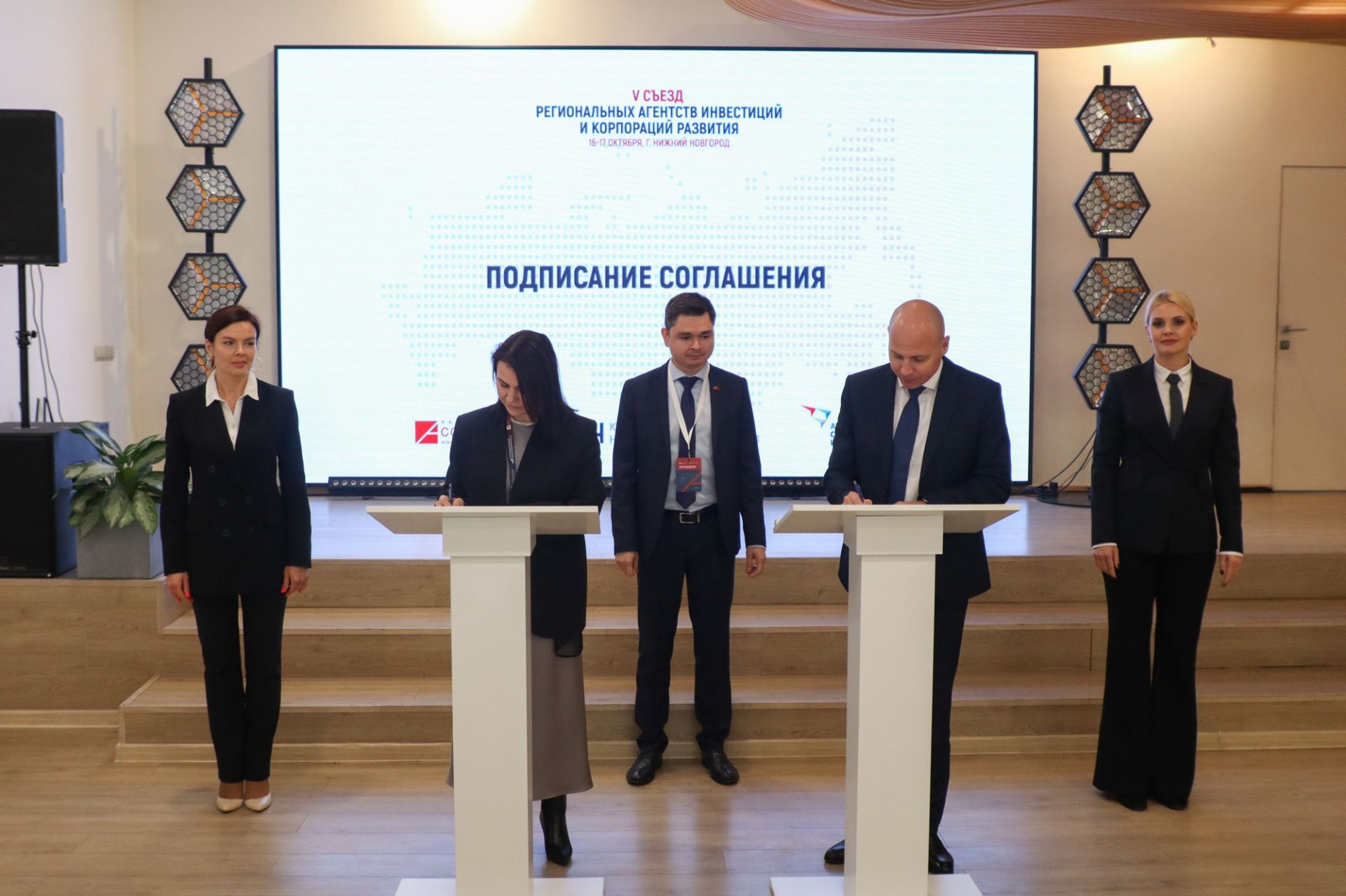 17:44Заместитель генерального директора Корпорации развития Нижегородской области Антон Гаранин и руководитель Агентства по привлечению инвестиций и региональному развитию Воронежской области Елена Лапина подписали соглашение о сотрудничестве. Церемония подписания состоялась в рамках V съезда региональных агентств инвестиций и корпораций развития некоммерческой организации «Национальная Ассоциация агентств инвестиций и развития» (НААИР), проходящего 16-17 октября в Нижнем Новгороде.