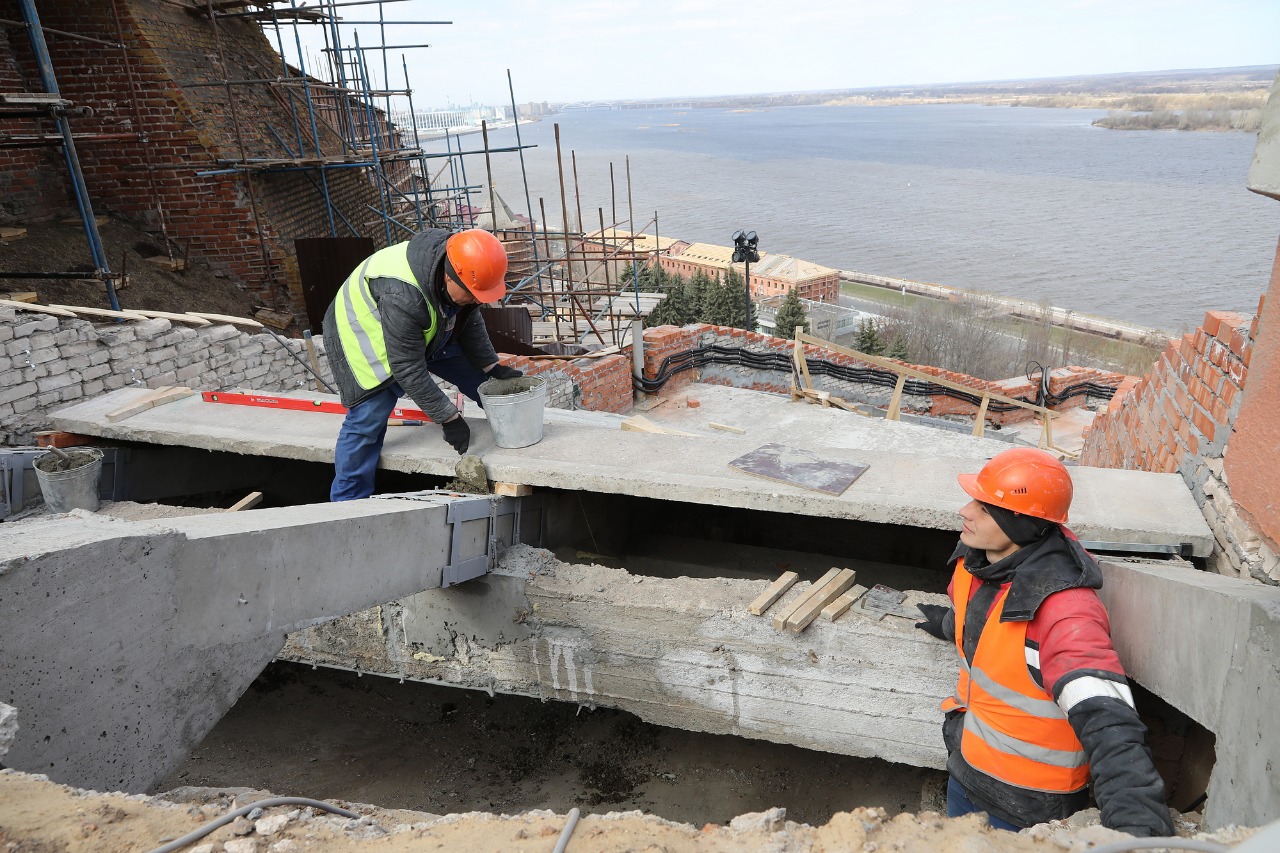 По нижнему кольцу Чкаловской лестницы заменены все железобетонные конструкции, усилены подпорные стены. Работы по укладке новых ступеней выполнены на 10%. Проводится подготовка к торкретированию — укреплению бетоном — железобетонных конструкций и участка стен подлестничного пространства.