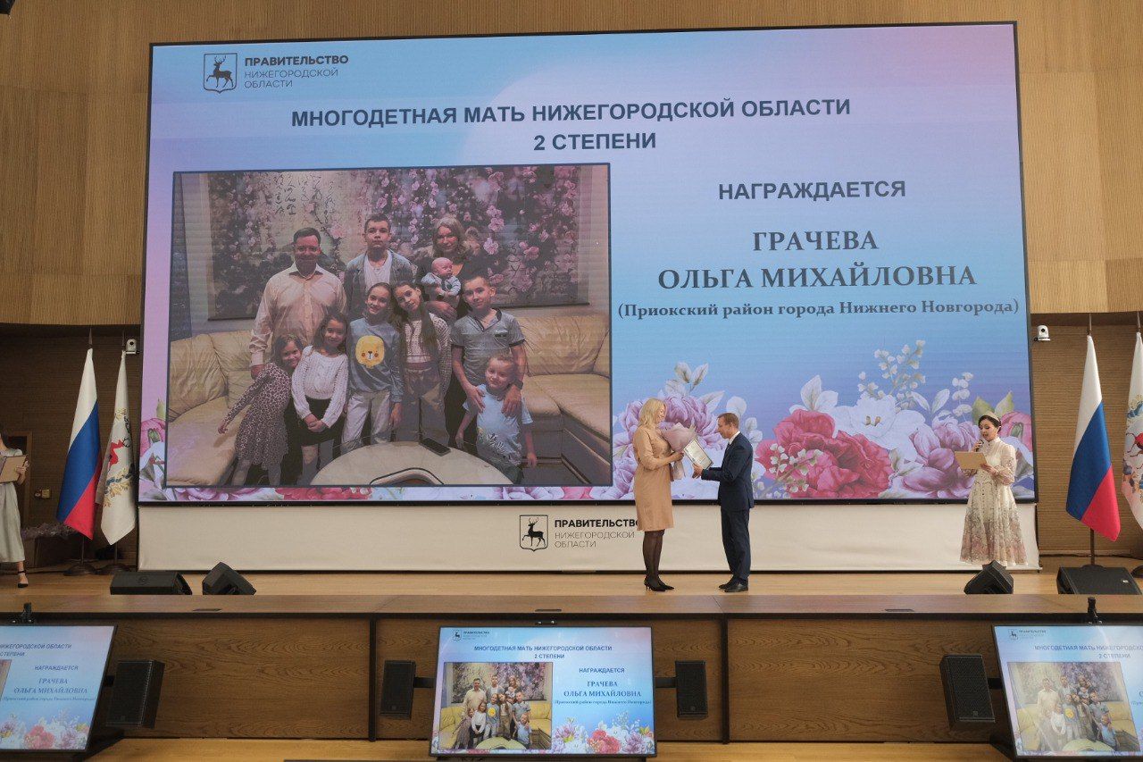 Жительница Сокольского муниципального округа Людмила Валерьевна Кузнецова вместе с супругом воспитали пятерых детей, а с 2008 года наряду с родными детьми воспитывают ещё и приемных. В настоящий момент в семье живет 10 несовершеннолетних детей, а в общей сложности через заботливые руки многодетной мамы прошло 24 ребенка. Главный секрет Людмилы Валерьевны как многодетной матери — это бесконечная любовь ко всем своим детям. Сегодня ей был вручен почетный диплом многодетной матери Нижегородской области II степени.