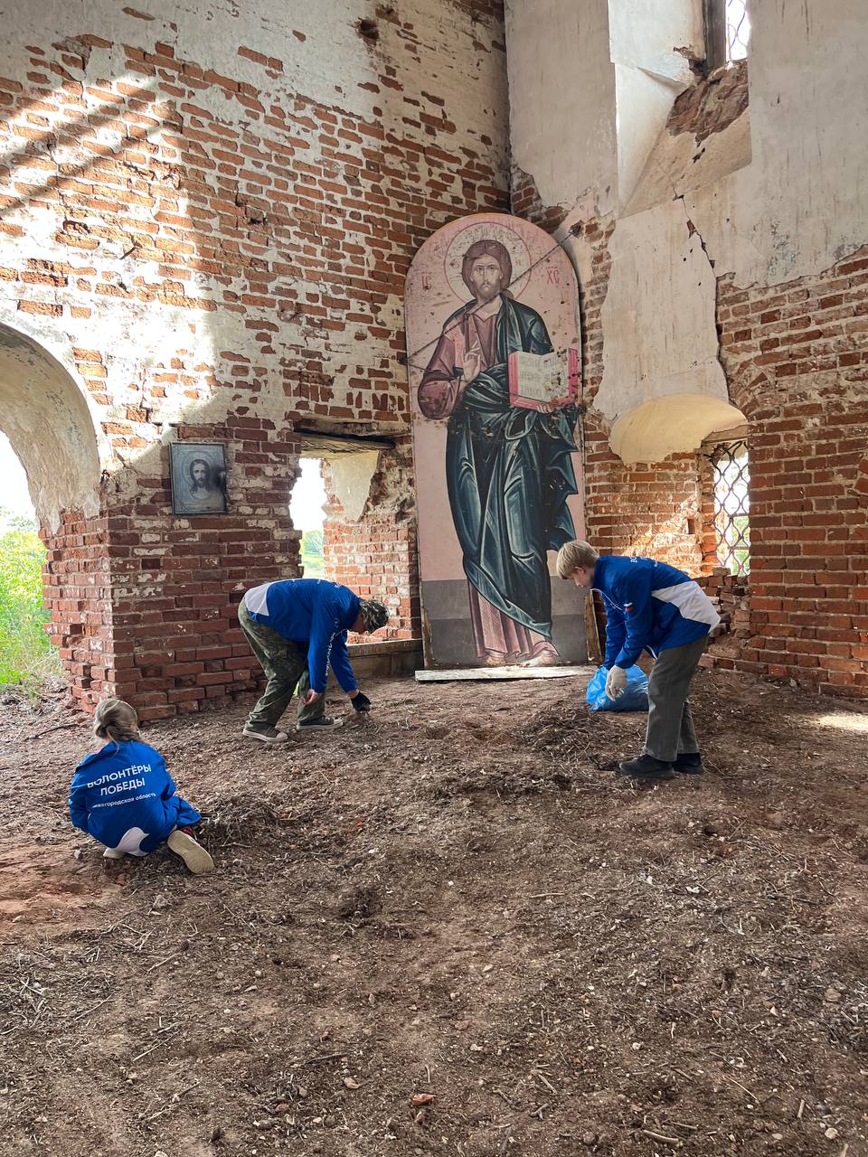 30 волонтеров Победы в течение дня привели в порядок внутренние помещения церкви, а также территорию, прилегающую к храму: очистили ее от бытового мусора, камней, сухих веток и прошлогодней листвы, скосили траву и расчистили двор храма от зарослей кустарников, скрывавших архитектурные элементы здания.